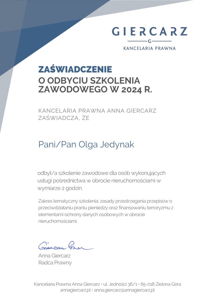 Jestem bardzo zadowolony z usług pani Olgi Jedynak. Od pierwszego spotkania do finalizacji zakupu domu, pani Olga wykazała się niesamowitą wiedzą i profesjonalizmem. Zawsze mogłem na nią liczyć, a jej podejście do klienta było wyjątkowe. Dzięki niej cały proces przebiegł sprawnie i bez komplikacji. Gorąco polecam panią Olgę jako agenta nieruchomości